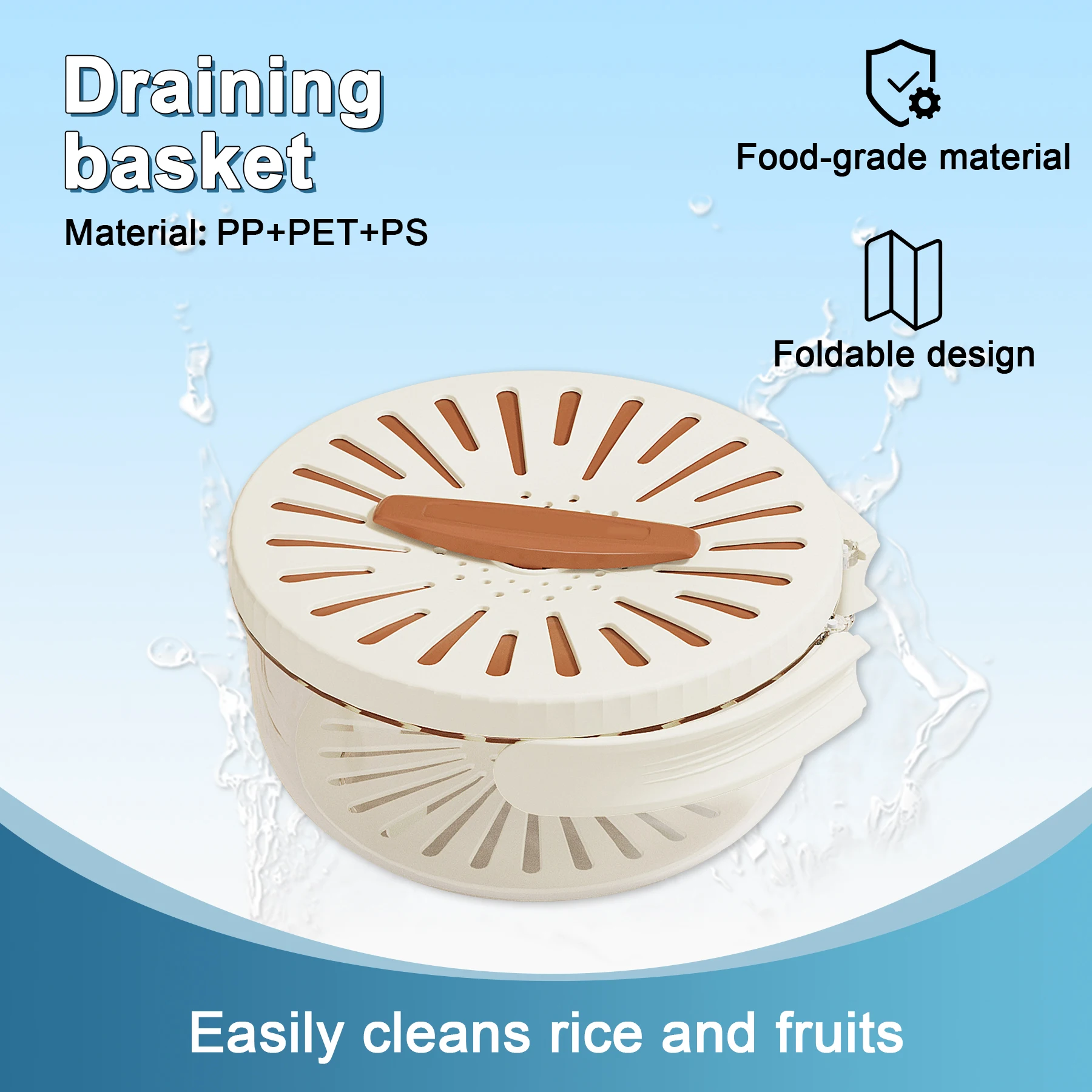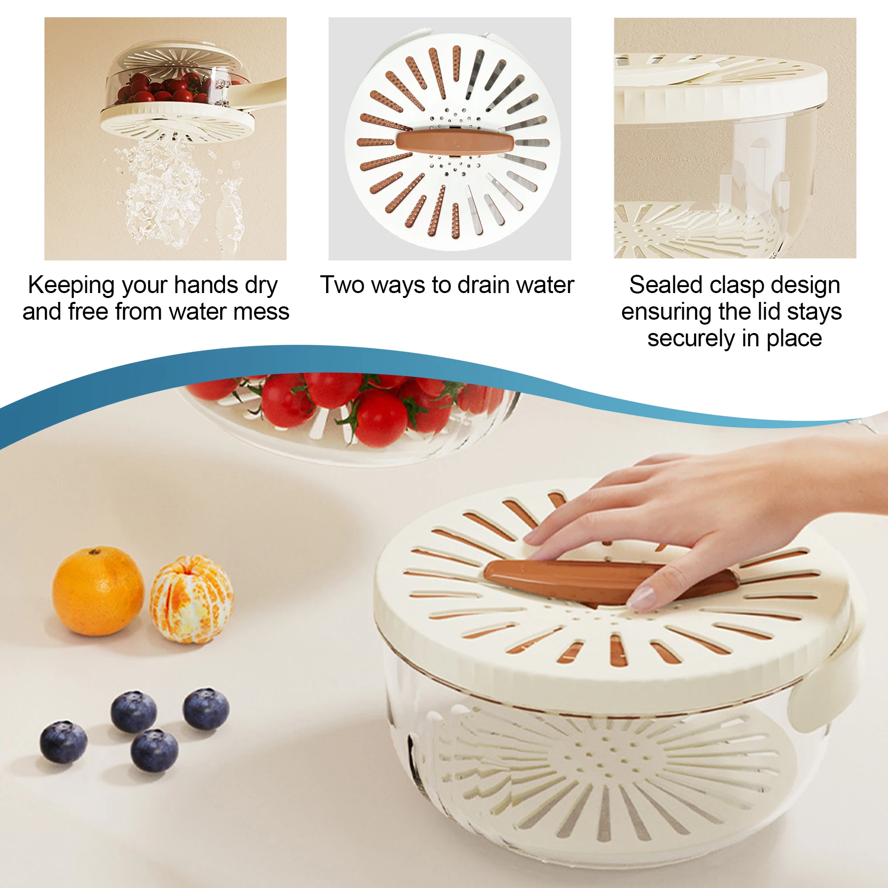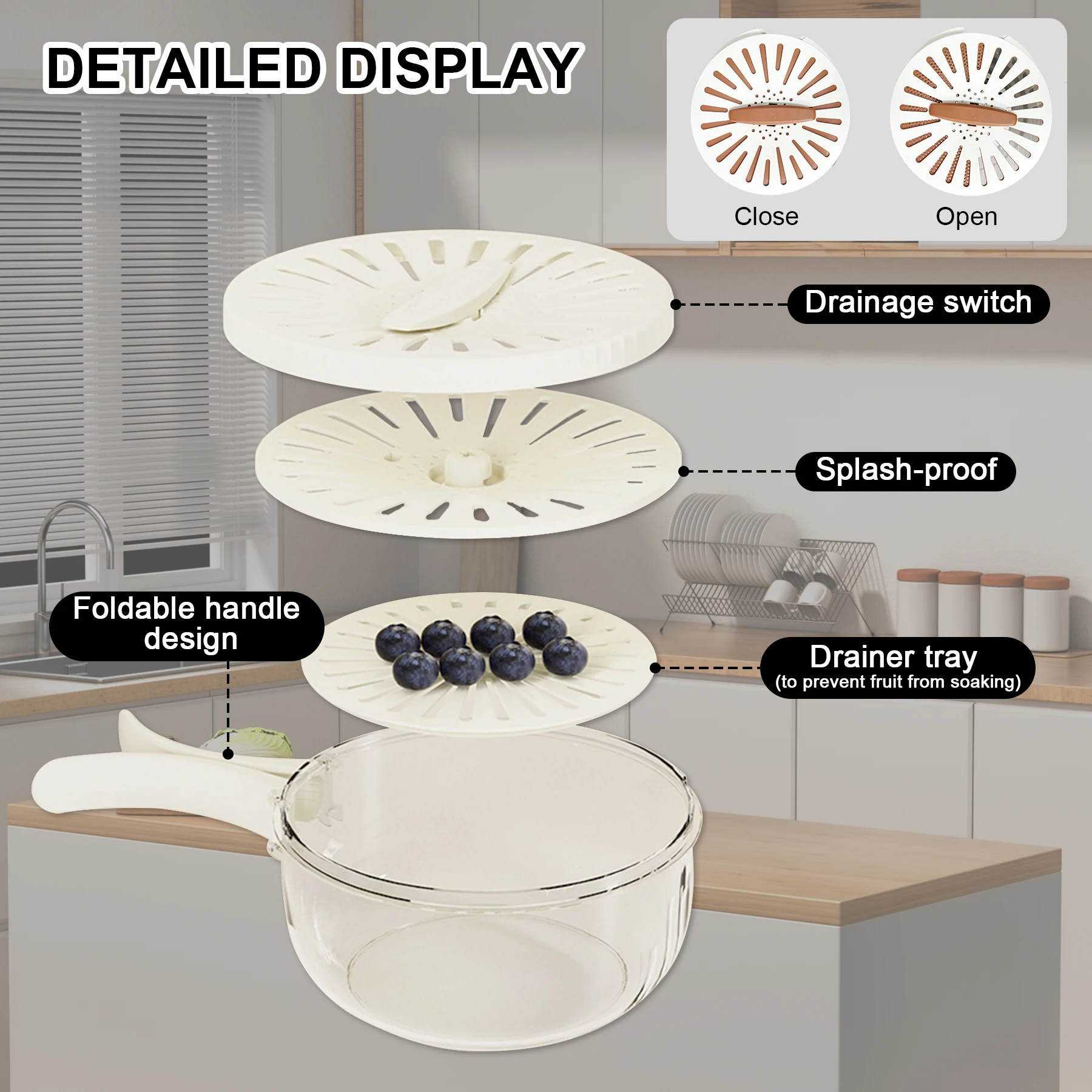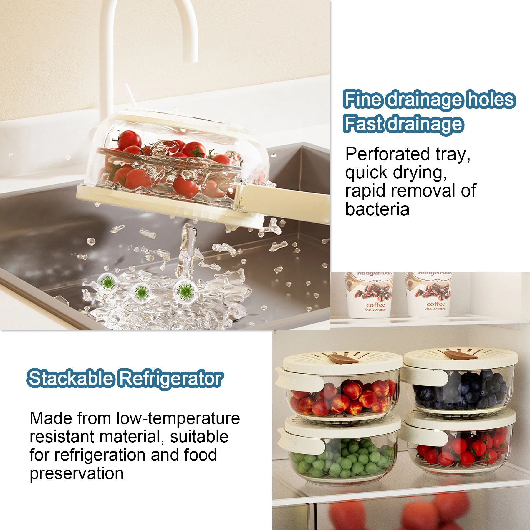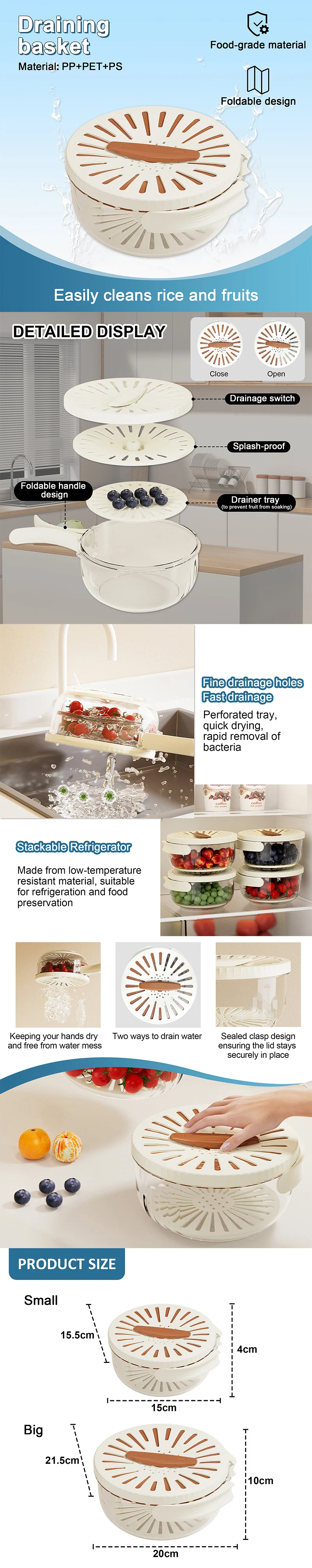 Brettbar dobbel-lags plastdramsle med dreneringslokk for vasking av grønnsaker og frukt samt oppbevaring av mat i kjøkkenet