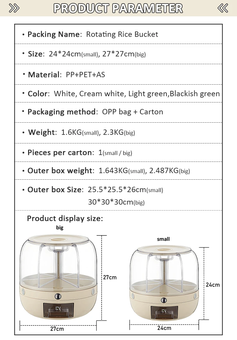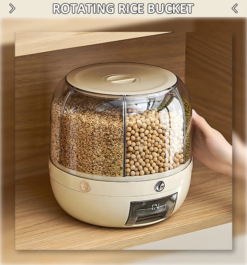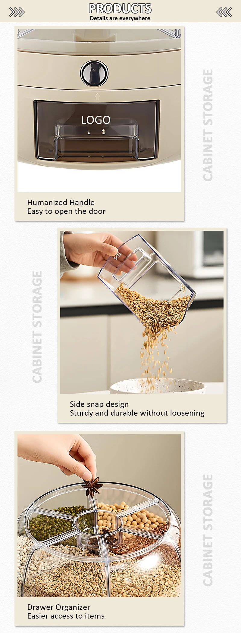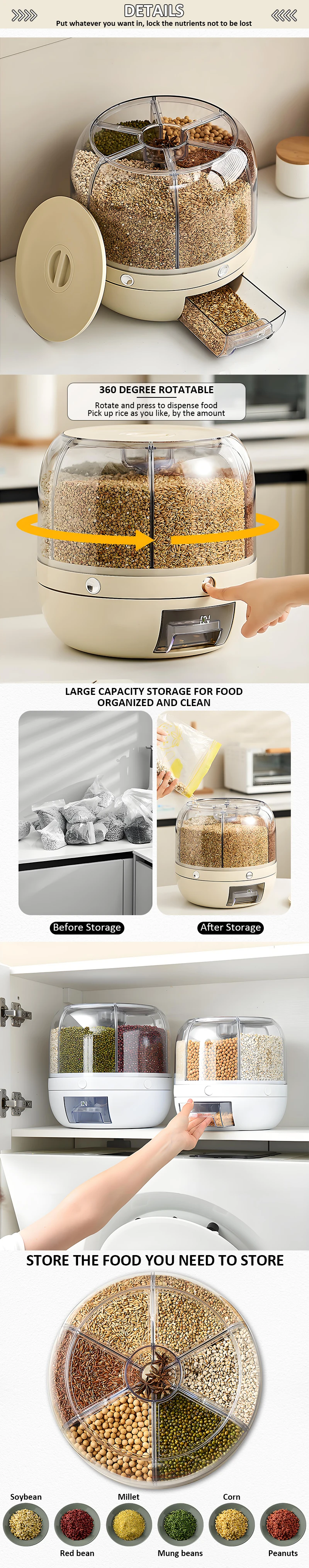 Recipiente Plástico de Armazenamento de Alimentos com Grade Rotativa de 6 Divisórias, à Prova de Umidade, para Cozinha, Caixa de Armazenamento para Arroz, Cereal e Grãos