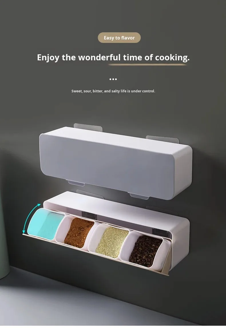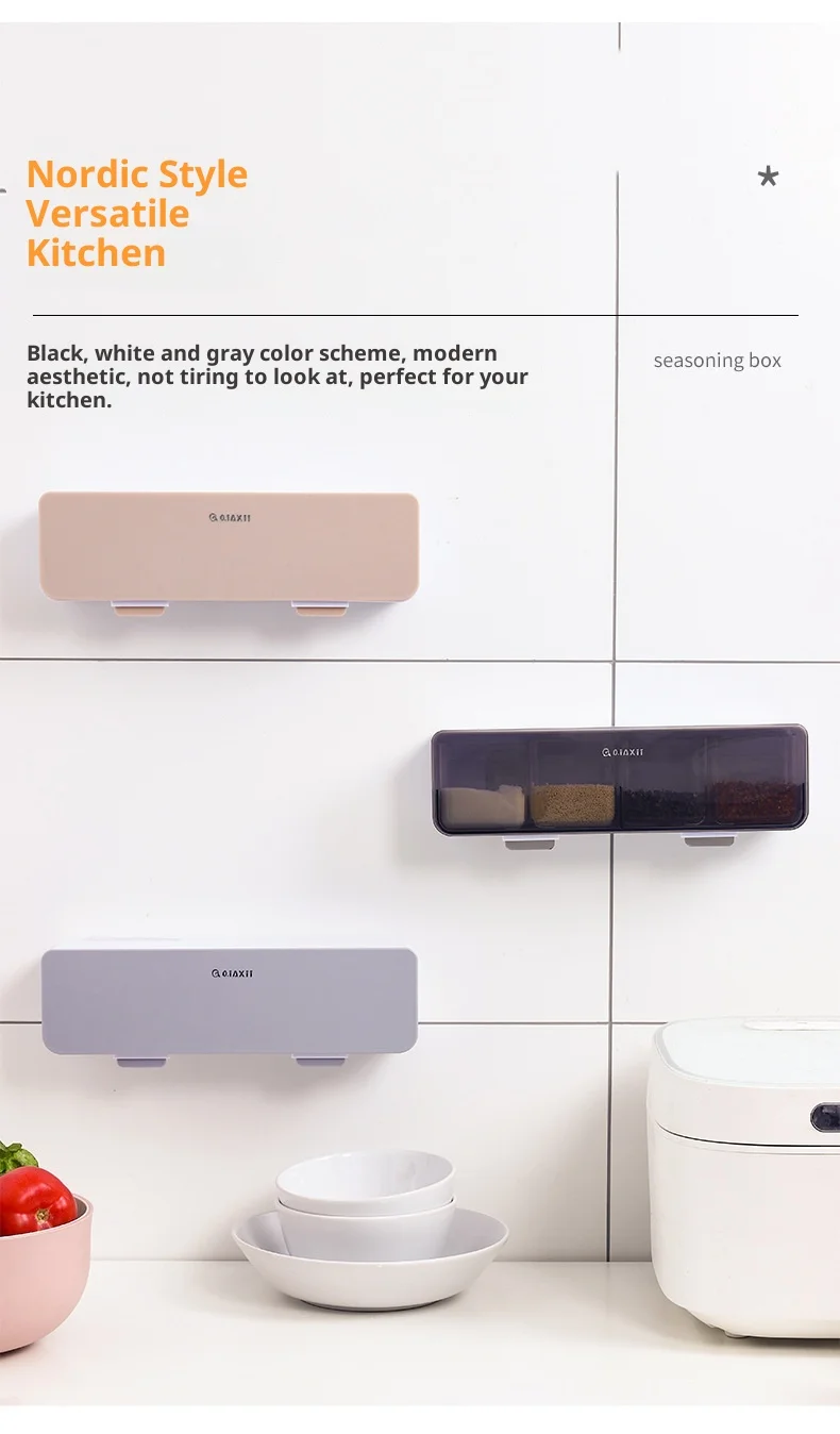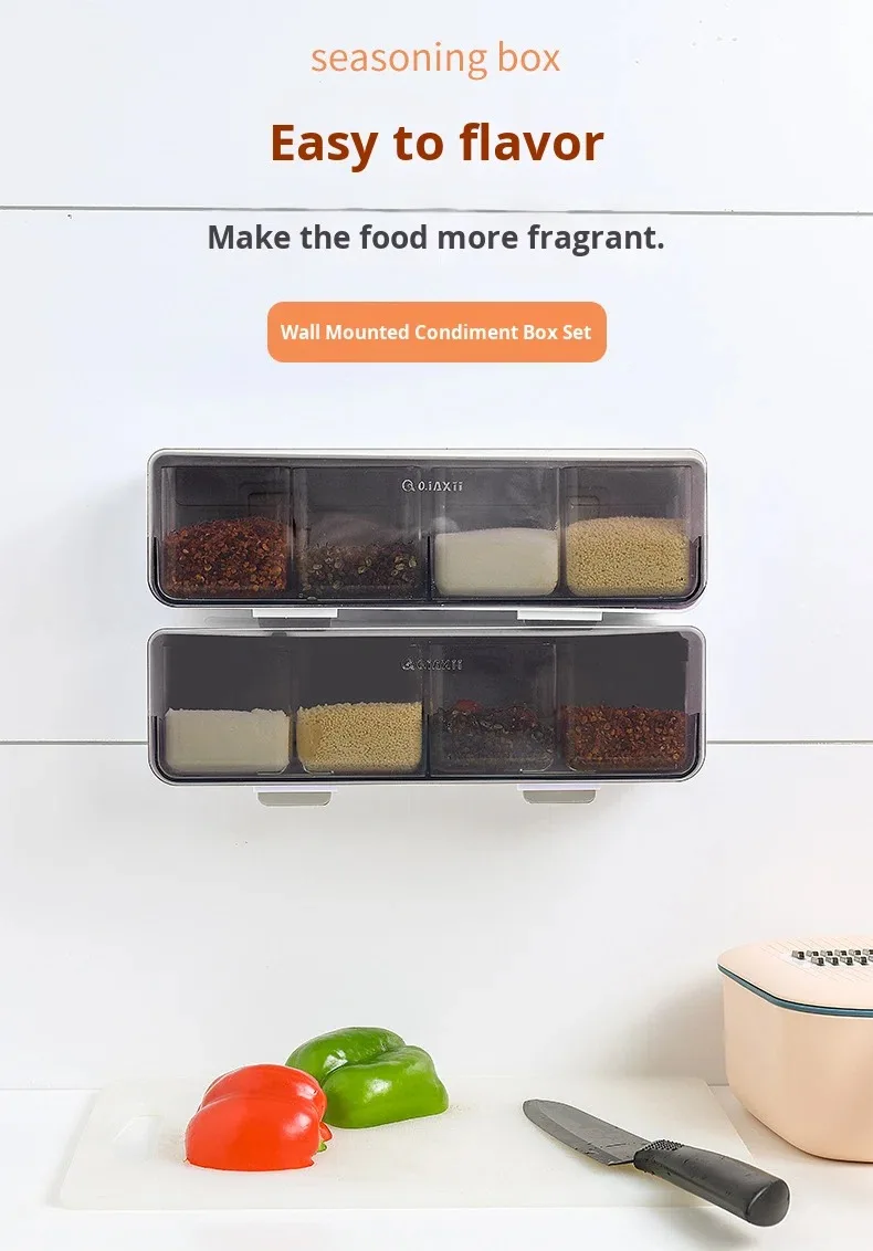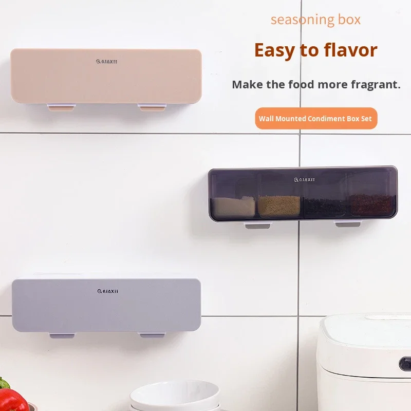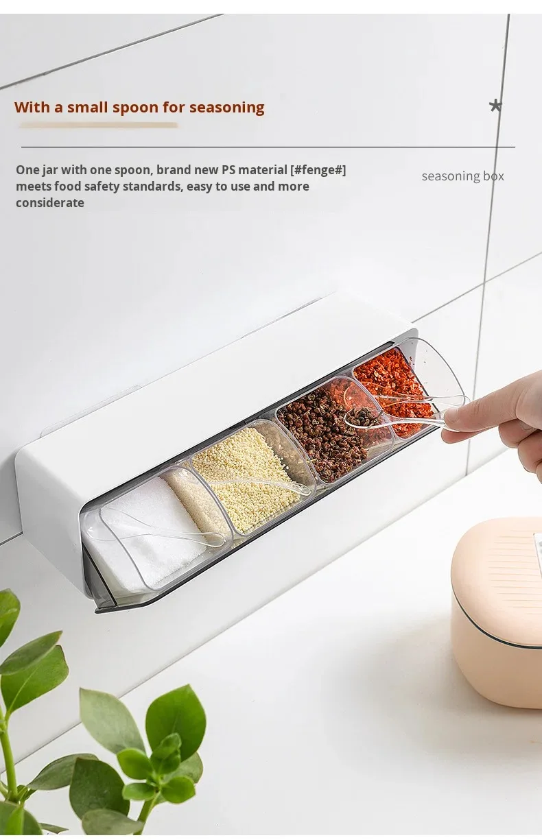 Conjunto de Caixa de Temperos de Parede com Quatro Compartimentos sem Perfuração, em Plástico, Seguro para Lava-Louças e Forno, Design Sustentável para Temperos Domésticos