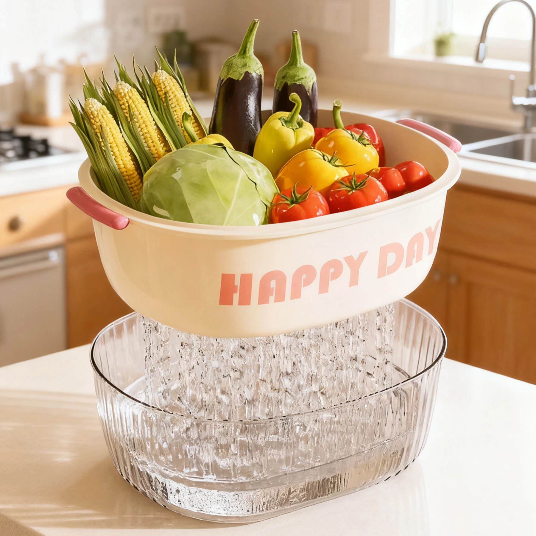 Atacado Novo Modelo Escorredor Plástico de Duas Camadas para Uso Doméstico na Cozinha com Filtragem de Água para Frutas e Legumes