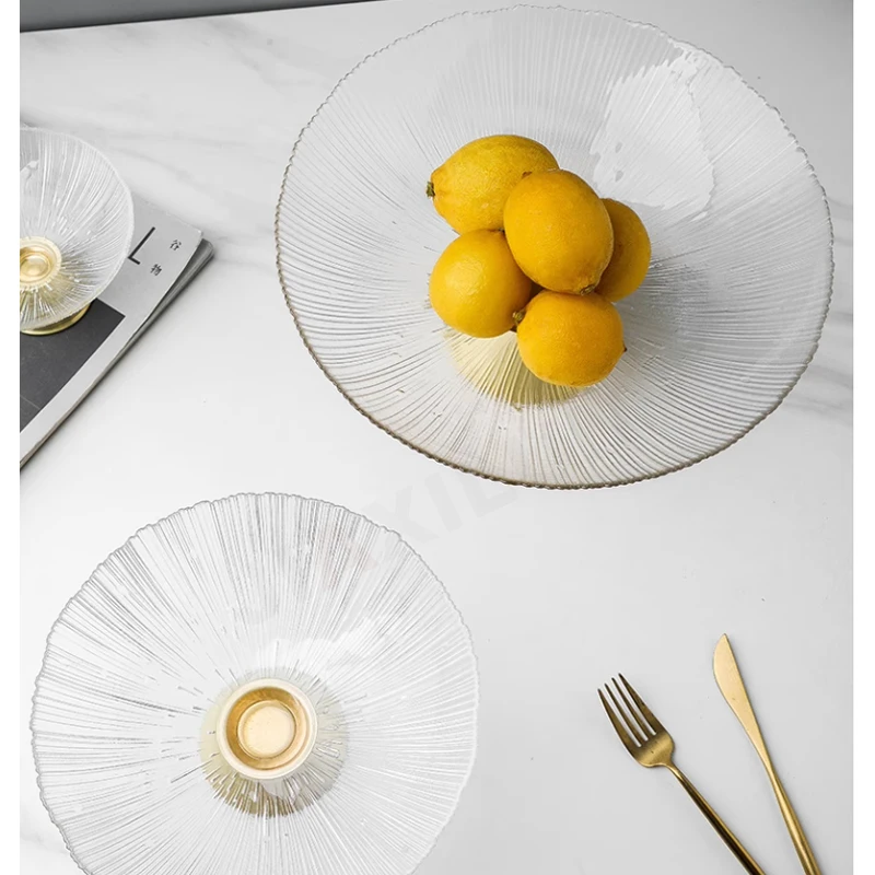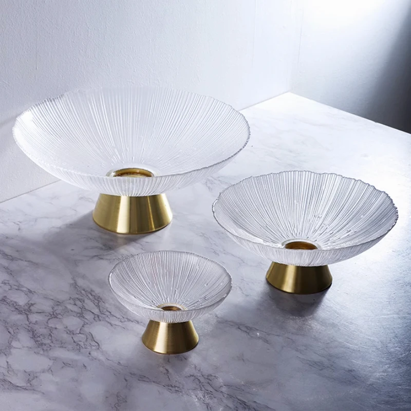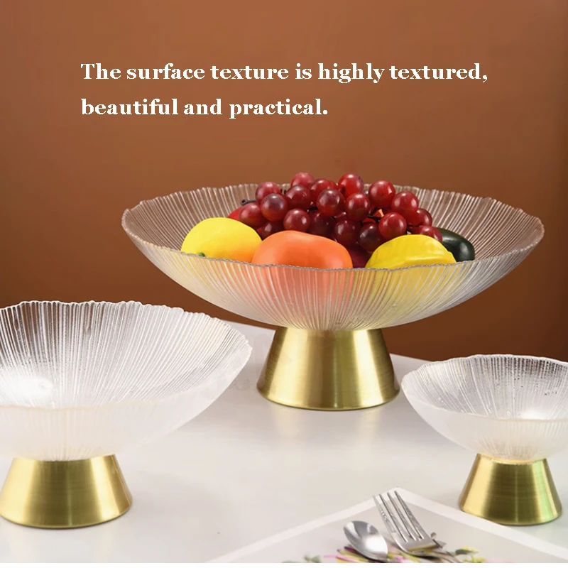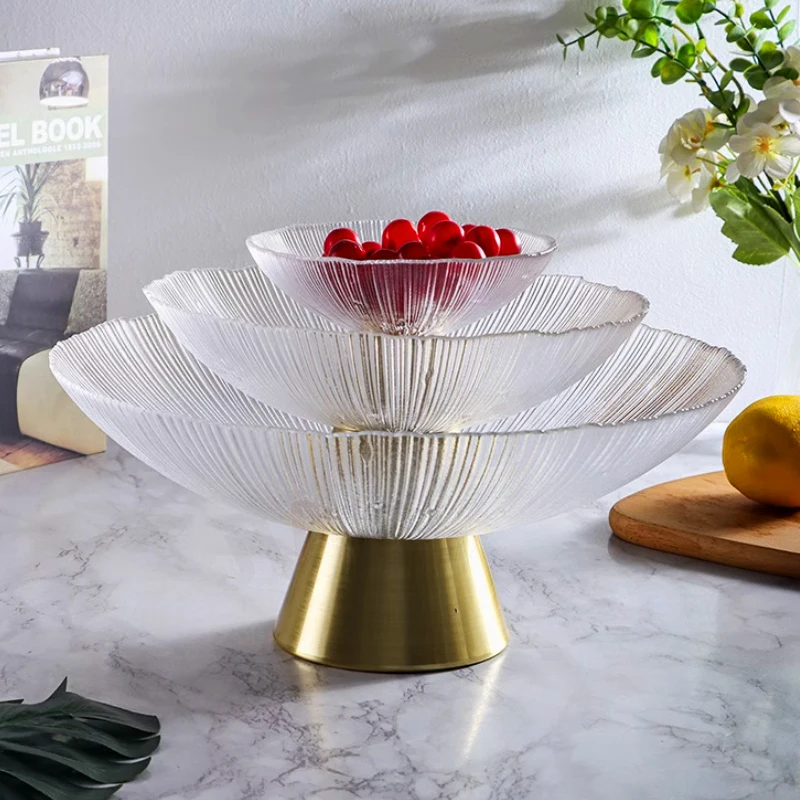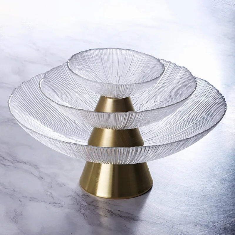 Большая емкость, круглый стеклянный поднос для фруктов, роскошное желтое металлическое основание, устойчивая мебель для хранения, посуда, тарелки, растения